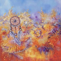 Catch dreamer – Modern abstract decorative painting orange blue mauve yellow Mixture of yellow orange blue sky and silver. Composed of generous materials. Inspired by lakota’s life. It’s a spiritual painting. aho Mitakuye Oyasin is a prayer for the harmony.