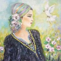 Woman and dove of peace – Portrait of a woman with a turban and a dove of peace – contemporary painting – hand painted square painting This painting is a portrait of a woman with a turban and a dove very symbolic. The background is worked with shades of green water yellow turquoise The colors are soft.