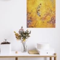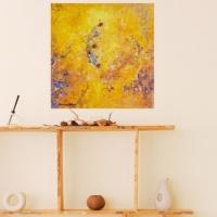 Tableau abstrait sur toile, peinture travaillée avec des reliefs. Tons dominants jaune orange mauve