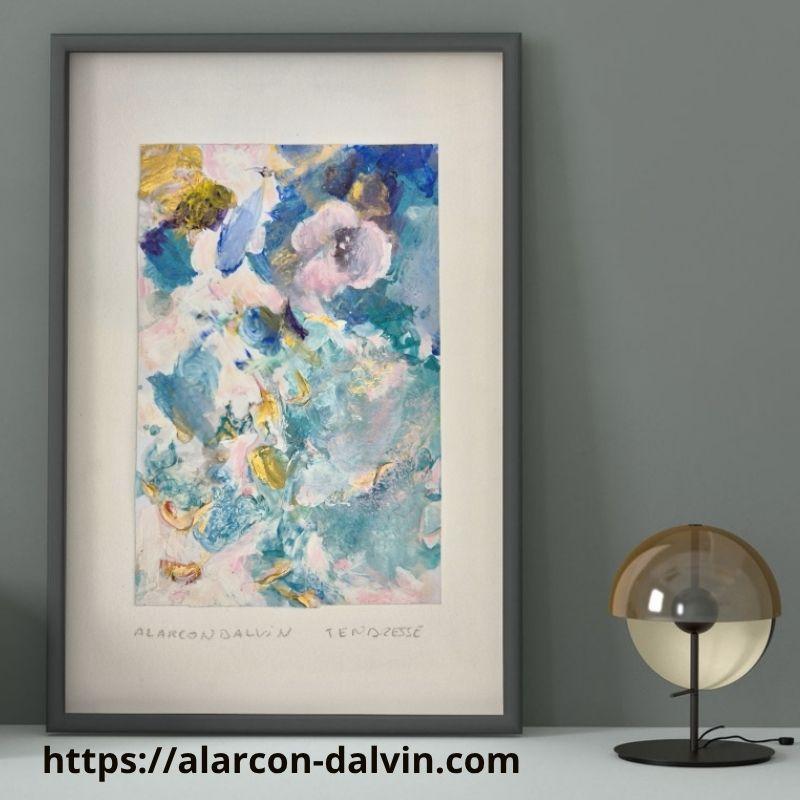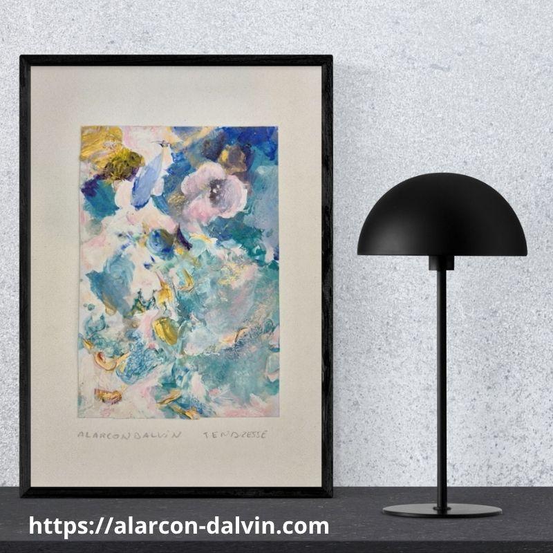 Tendresse est une peinture abstraite sur papier réalisée à l’acrylique au couteau par l’artiste peintre Alarcon Dalvin.