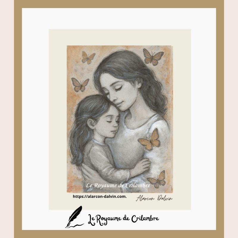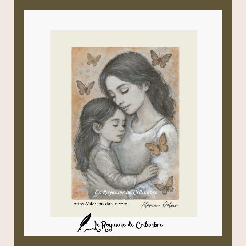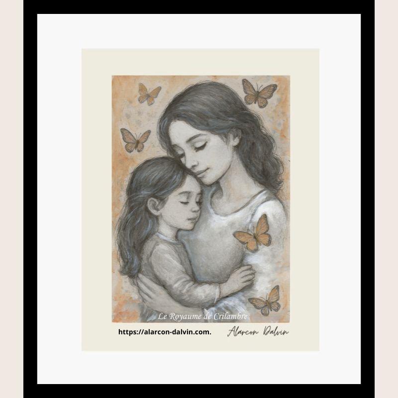 La Séparation Douce est une œuvre originale réalisée à l’acrylique sur papier Beaux-Arts, mettant en scène une mère et sa petite fille dans un moment tendre et intime. Autour d’elles, une envolée de papillons surgit, symbole délicat de l’envol, du passage, et de ces séparations temporaires qui jalonnent la relation mère-enfant.