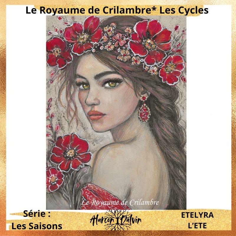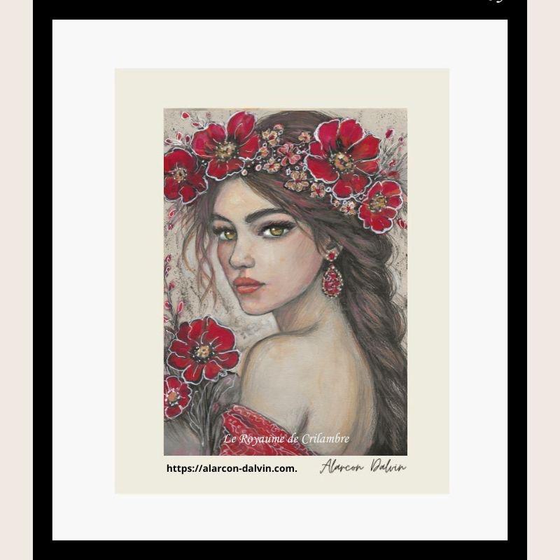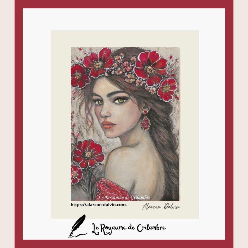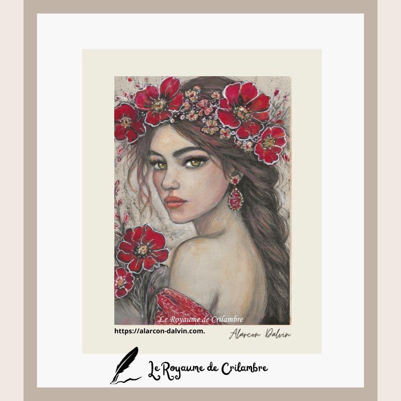 Découvrez Etelyra, un portrait de femme aux fleurs rouges de coquelicots dans les cheveux, symbole de l’été, de la vitalité et de l’énergie solaire. Cette œuvre sur papier fait partie de la collection Les Cycles de Crilambre, qui explore les saisons, les émotions et la lumière intérieure. Les couleurs chaudes – rouge éclatant des coquelicots et touches d’ocre dans la chevelure et le vêtement, fond beige clair – créent un contraste lumineux et harmonieux, tandis que l’encre noire souligne les contours et apporte profondeur et intensité.