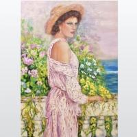 Femme au bord de mer – Choisissez ce tableau de femme au bord de mer aux couleurs rose vert bleu, très fleuri, pour une ambiance sereine. Oeuvre unique. Artiste peintre Alarcon Dalvin