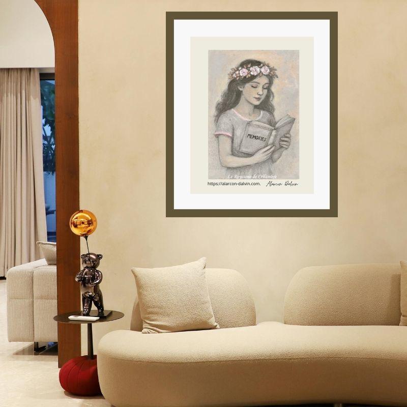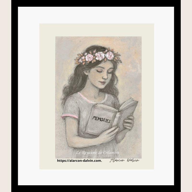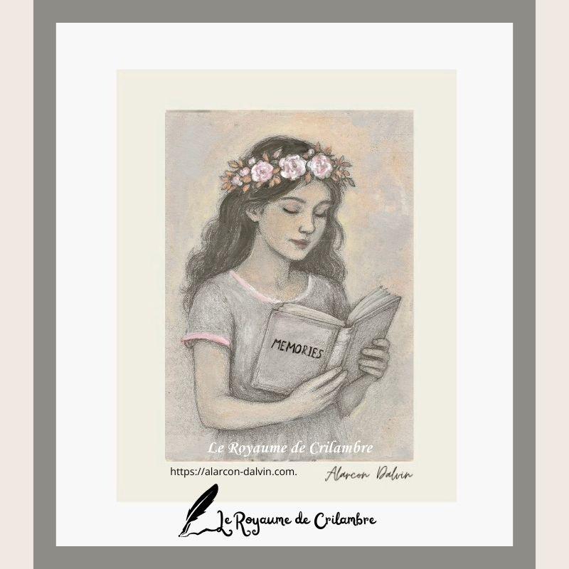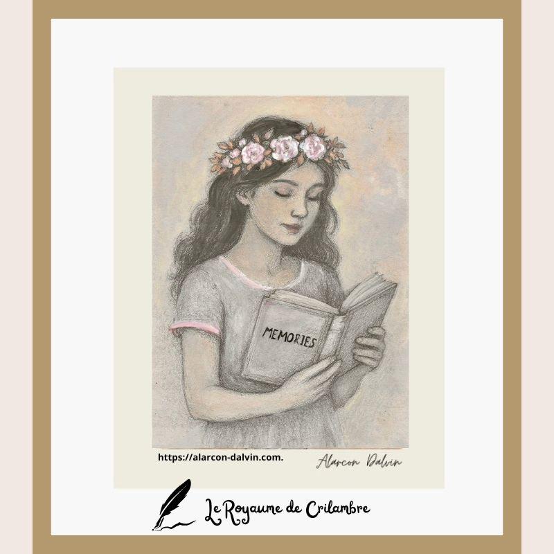 « Le Fil du Souffle » représente le portrait délicat d’une jeune femme, couronnée de fleurs, tenant entre ses mains un livre à la couverture marquée Memories. Autour d’elle, les couleurs se déploient comme un voile d’air, un passage invisible entre deux mondes. Cette œuvre mêle douceur et mystère, comme un murmure suspendu entre le présent et l’héritage des générations.